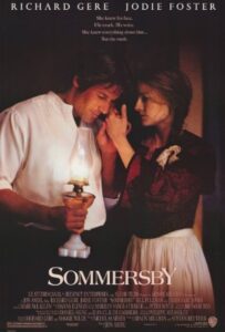 Sommersby is a 1993 romance/drama film starring Jodie Foster and Richard Gere. Jack Sommersby (Richard Gere) returns home to the South after the Civil War, seven years after he left as a soldier. He’s a changed man, kind and caring, and his wife Laurel (Jodie Foster) ends her engagement to live with him. However, suspicions arise that he may not be who he says he is.