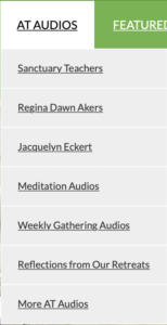 The new AT Audios menu includes all of our member audios. Under “Sanctuary Teachers,” you’ll find audio recordings from people like Anne Blanchard, Helen Avery, Kate Brennan, The Mighty Companions and more.