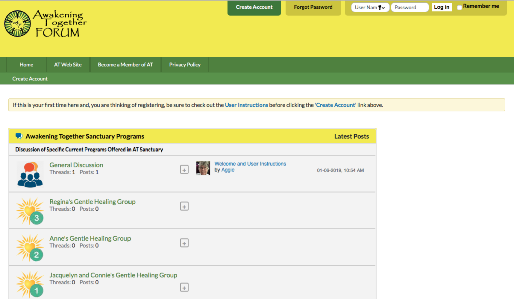 The Forum will be used heavily in Gentle Healing Year 3. It will also be used in other Gentle Healing Groups, in the Minister’s Preparation Program (MPP), and in relation to the Awakening Together Retreat House, just to name a few ways we will use the Forum.