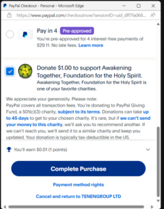 • Effortless Giving: Each time you make a purchase through PayPal, you’ll have the chance to donate $1 (or more) to Awakening Together. It’s a seamless way to contribute without any extra steps.